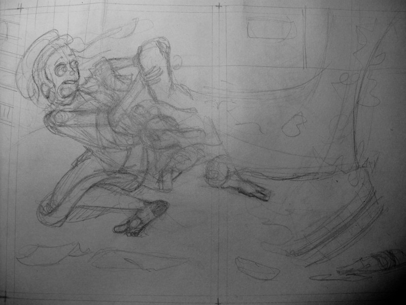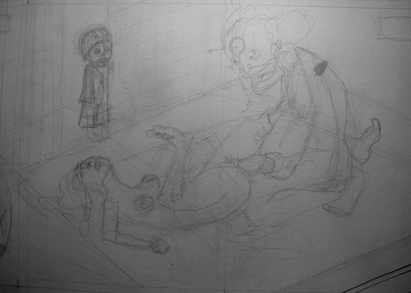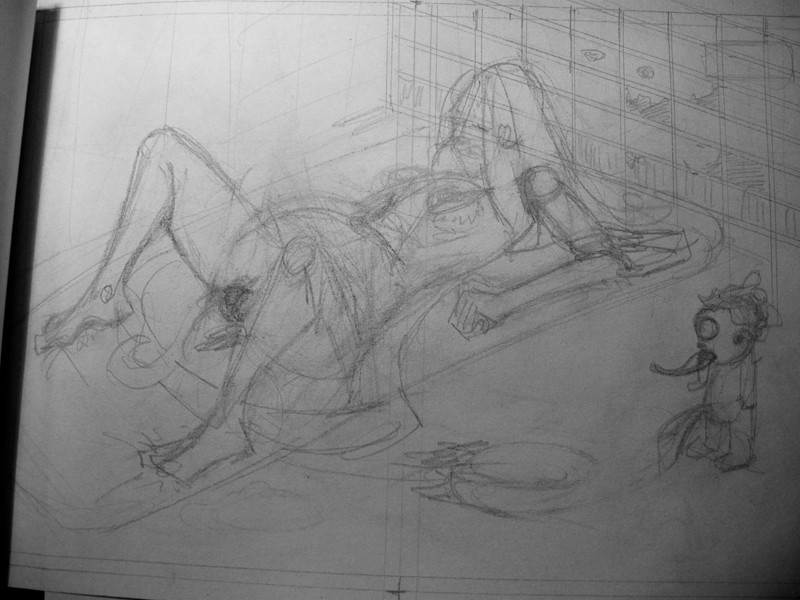 Donc voilà: j'ai fait un story board de 20 images, crayonné 6 images et encré une seule sur le rouleau. Trop chiant. Puis encré deux autres sur feuilles A3 de photocopieuse. Ah, ça va mieux, mais la motivation n'y est pas: dommage de faire un encrage rapide et limité sur ces crayonnés, que j'ai du mal à rechopper sur la table lumineuse.
