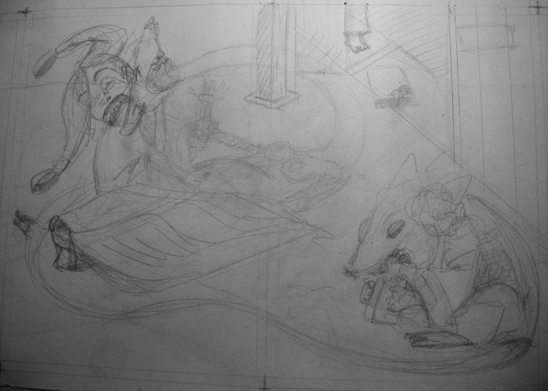 Bref. J'étais donc pas trop motivé, à la fois par le thème (que j'ai déjà travaillé, sur lequel j'ai mes propres histoires à raconter, mais pas en 25H) et le fait que l'on puisse choisir BD ou illustration, pas de format de page indiqué. C'est là que j'ai chié et à la fois c'était une bonne expérience: j'ai découpé une partie d'un rouleau de papier dont j'ignorais la provenance et j'ai fait des A3 qui se suivaient, en illustration, de gauche à droite, reprenant à chaque fois un/des yokais. L'histoire d'une yokai geisha et d'un moine rat qui donnent naissance à un cyclope et une fille renard. Pour parler simplement.