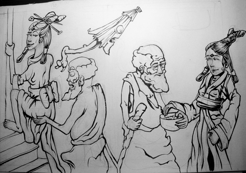 - test d'un matériel: ben ouais, tester du papier alors qu'on doit aller vite, ça le fait pas ! Surtout si le papier absorbe que dalle et que le thème japonais impose un trait nerveux et rapide.