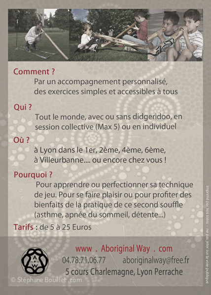 Publié dans Graphisme Voir plus de didgeridoo Flyer Yidaki Flyer (Graphisme) Proposition de flyer recto verso pour une association donnant des cours de didgeridoo