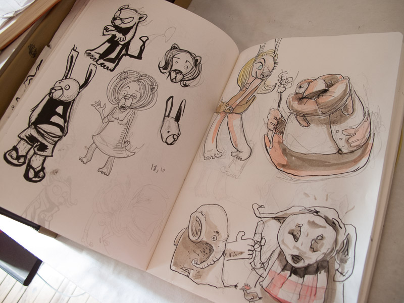 - des animaux comme personnages: pour l’occasion, j’avais quelques heures avant fait des recherches de personnages, et sont apparus les personnages du morse, hérisson, lapin(e) et chatte. Et j’ai adoré ! D’abord parce que je suis véto, mais aussi parce que ça donne une réelle variété de bestioles, une diversité: non seulement au niveau du nombre d’espèce, avec des espèces obèses (morse, rhinocéros…), des espèces agressives etc, mais aussi avec une variation interne à chaque espèce: un cochon peut très bien être gras ou maigre, une souris avoir un petit ou un long museau… À refaire et développer donc, à la manière magistrale de Julien Loïs. Et puis, tout le monde aime les animaux. L’anthropomorphisme est par ailleurs quelque chose de très vieux, avec notamment les caricatures de Grandville