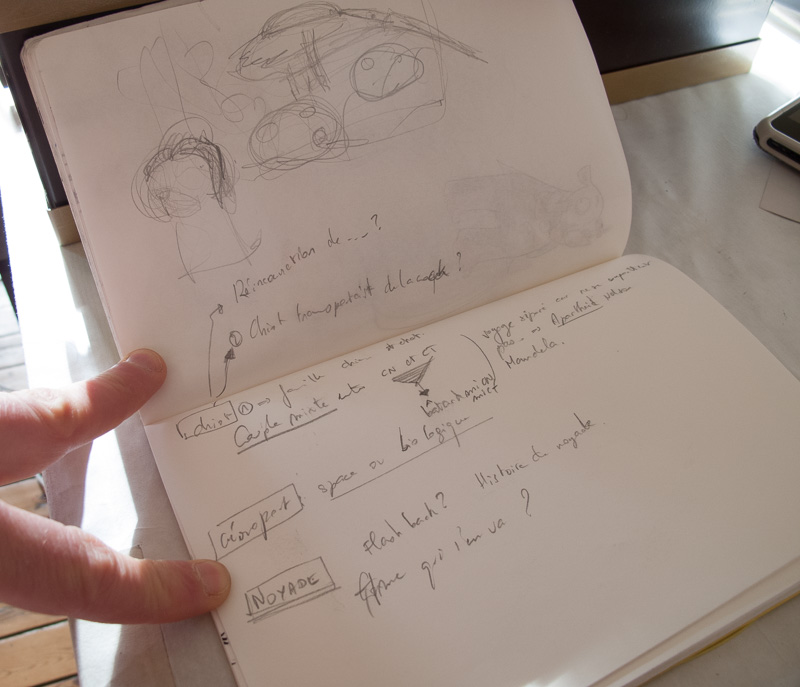 - un scénario ouvert: à la manière de Frederik Peeters dans Lupus, je voulais que le scénario se fasse au fur et à mesure, sans avoir de contraintes, mais au contraire une totale liberté de pouvoir me dire et si je faisais ça ? Et une fois de plus j’ai adoré ! Laisser libre cours à son imagination, à la folie de la spontanéité ! Alors c’est sûr que quand je vois le scénario de Boulet hyper construit avant de commencer ses pages, je me dis que j’ai encore du chemin, mais je suis quand même fan de la liberté de l’instant, comme l’utilisais aussi par ailleurs Moebius