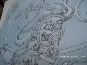 Lili dans l'espace Illustration Lili aux prises avec... Premier lavis à l'aquarelle, après avoir posé les contours et les ombres / textures à l'encre, au rotring.
