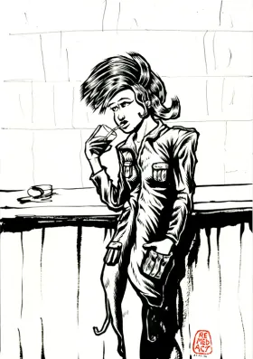 Dessin réalisé lors des sketch night à la Société des illustrateurs de New-York. Pauses de 20 minutes. Une femme nue à la chevelure ébouriffante tient un pistolet fumant