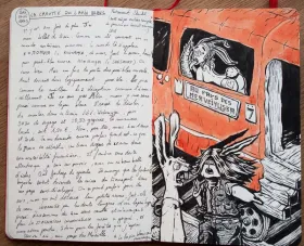 Une boite de sardines sur les routes carpatiennes Illustration Ecriture Sketchbook analytique. Association de textes et de dessins les illustrant.