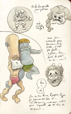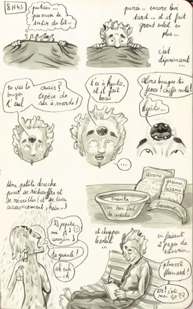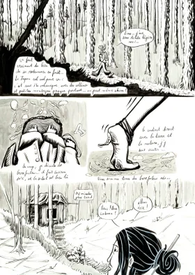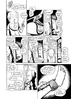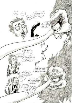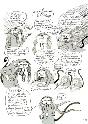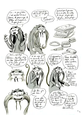 Un bar sur une plage distribue café, bière et pizza, devant un spot de surf océanique australienne. Sont présent un lio barman, une chatte, un ornithorynque et un koala.
