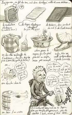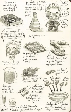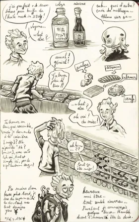 premiers contacts avec l'alimentation japonaise: baguettes, rayons d'un supermarché alimentaire japonais (sauce soja, miso, poulpe, huile de colza, huile de sésame, oeuf de poisson, calamar)