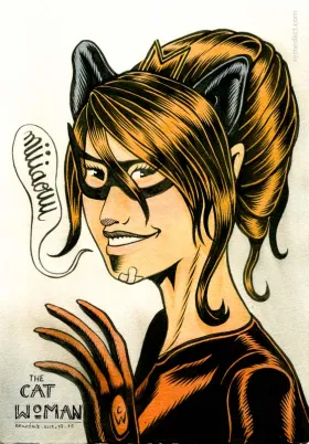 Cat woman in red suit Illustration Cat woman in red suit A la base c'est le portrait de M., une copine qui parle très bien la langue des chats, et qui s'était fracassé le menton après une chute de vélo.