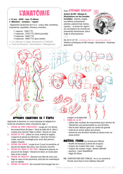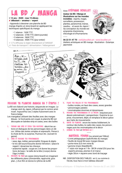 Je donne des ateliers artistiques (encore appelé workshop ou tutoriel), en présentiel ou distanciel (vidéo), que ce soit dans le milieu scolaire, entreprise, médiathèques, festivals et salons, quelque soit le niveau (du débutant aux professionnels en passant par l'amateur).