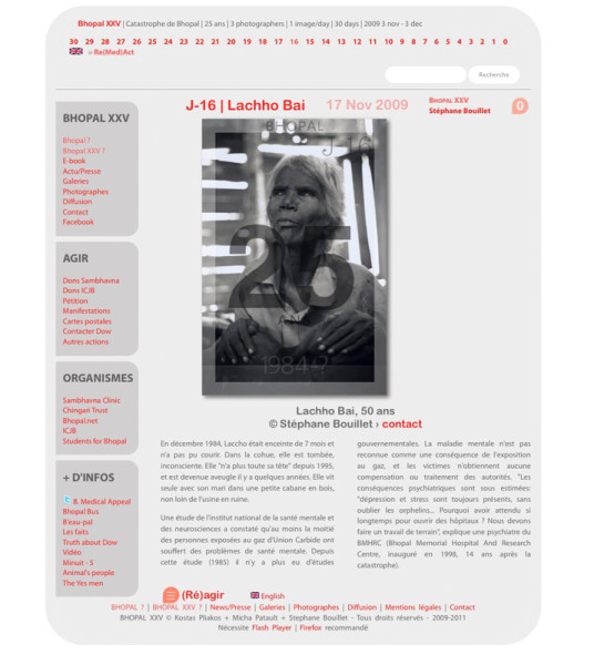 Publié dans Web Design Voir plus de Catastrophe de Bhopal Bhopal XXV Stéphane Bouillet Bhopal PhotoBlog + Webzine: 1 photo par jour pour les 25 ans de la catastrophe de Bhopal › Aller à Bhopal XXV (Nouveau design) © Stéphane Bouillet › contact