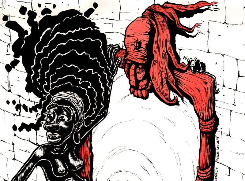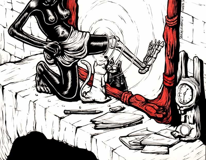 Black Alice traverse le miroir, laissant derrière elle son ancienne vie. Alice, petite fille esclave africaine, passe le pied à travers le miroir menant au pays des merveilles. Le pied d'Alice, de l'autre coté du miroir, est devenu blanc, transformé en squelette. La chatte blanche regarde son reflet noir. Le miroir, posé sur la cheminée, a une espèce de masque africain au dessus, avec une souris qui regarde la scène. Une pendule blanche en forme de lapin donne l'heure.