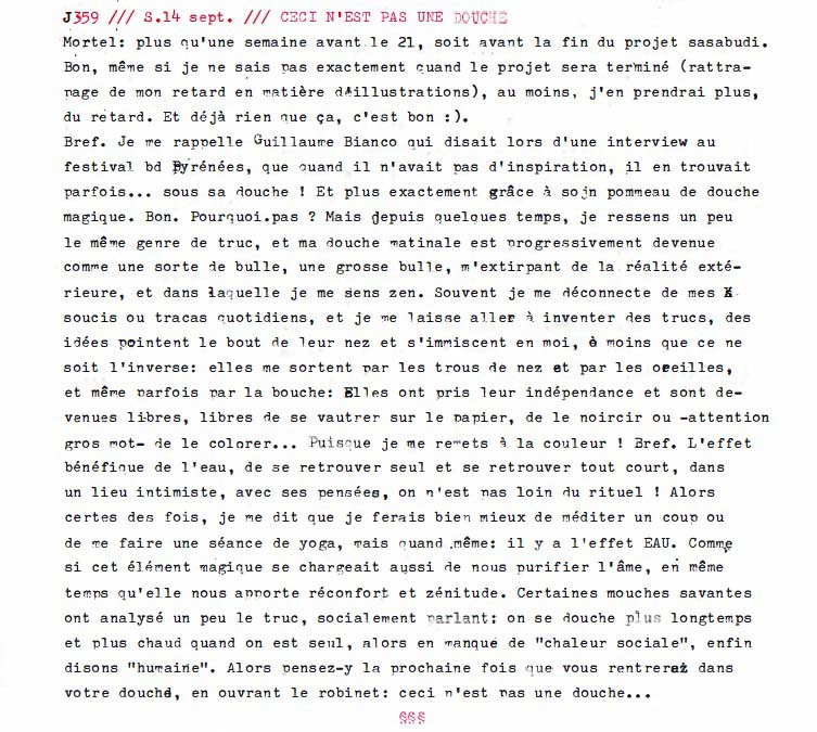 Mortel: plus qu'une semaine avant le 21, soit avant la fin du projet sasabudi. Bon, même si je ne sais pas exactement quand le projet sera terminé (rattrapage de mon retard en matière d'illustrations), au moins, je n'en prendrai plus, du retard. Et déjà rien que ça, c'est bon :). Bref. Je me rappelle Guillaume Bianco qui disait lors d'une interview au festival BD Pyrénées, que quand il n'avait pas d'inspiration, il en trouvait parfois… sous sa douche ! Et plus exactement grâce à son pommeau de douche magique. Bon. Pourquoi. pas ? Mais depuis quelques temps, je ressens un peu le même genre de truc, et ma douche matinale est progressivement devenue comme une sorte de bulle, une grosse bulle, m'extirpant de la réalité extérieure, et dans laquelle je me sens zen. Souvent je me déconnecte de mes soucis ou tracas quotidiens, et je me laisse aller à inventer des trucs, des idées pointent le bout de leur nez et s'immiscent en moi, à moins que ce ne soit l'inverse: elles me sortent par les trous de nez et par les oreilles, et même parfois par la bouche. Elles ont pris leur indépendance et sont devenues libres, libres de se vautrer sur le papier, de le noircir ou -attention gros mot- de le colorer… Puisque je me remets à la couleur ! Bref. L'effet bénéfique de l'eau, de se retrouver seul et se retrouver tout court, dans un lieu intimiste, avec ses pensées, on n'est pas loin du rituel ! Alors certes des fois, je me dit que je ferais bien mieux de méditer un coup ou de me faire une séance de yoga, mais quand même: il y a l'effet EAU. Comme si cet élément magique se chargeait aussi de nous purifier l'âme, en même temps qu'elle nous apporte réconfort et zénitude. Certaines mouches savantes ont analysé un peu le truc, socialement parlant: on se douche plus longtemps et plus chaud quand on est seul, alors en manque de "chaleur sociale", enfin disons "humaine". Alors pensez-y la prochaine fois que vous rentrerez dans votre douche, en ouvrant le robinet: ceci n'est pas une douche…