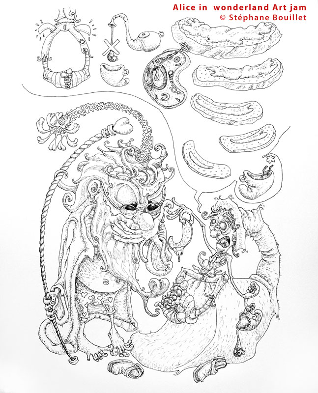 Quand il s'agit de traduire Alice au pays des merveilles en art visuel, ça donne un livre "What is the Use of A Book Without Pictures" (que peut-on faire d'un livre sans images ?). Il s'agit de faire un livre d'Alice au pays des merveilles sans aucun texte, et de retracer toute l'histoire à partir d'images d'artistes divers et variés, afin de montrer les diverses inspirations et arts graphiques d'illustrateurs de tous pays ! Cette illustration correspond au paragraphe 476.1 du livre de Lewis Caroll: "Je ne suis qu'un pauvre homme, Votre Majesté, débuta le Chapelier d'une voix tremblante, et je n'avais pas encore commencé à prendre le thé… en tout cas pas depuis plus d'une semaine environ… et vu que, d'une part, les tartines de beurre devenaient de plus en plus minces… et que, d'autre part, les scintillations du thé… "