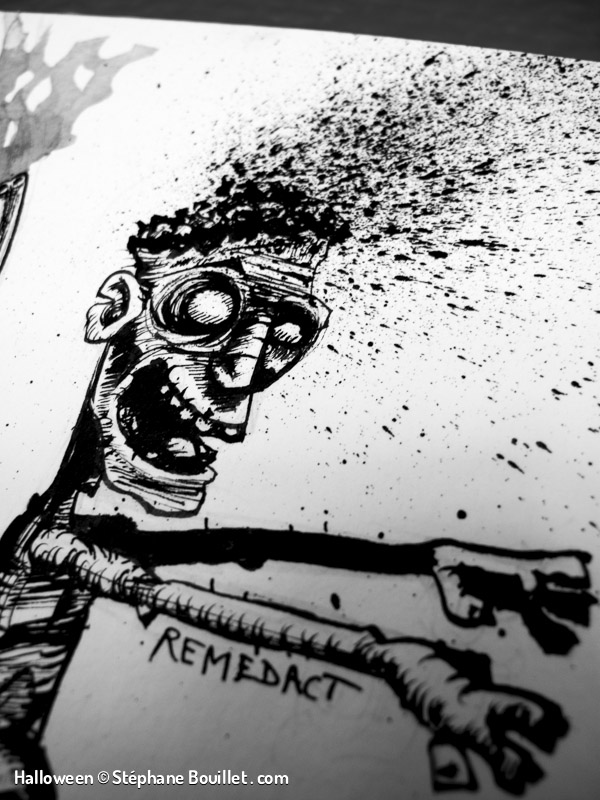Evolve or die: évolution de l’homme depuis le mollusque jusqu’au zombie en passant par le chimpanzé, le gorille et l’homo sapiens armé d’un fusil, tuant le zombie, mais se faisant arracher le bras par le gorille.