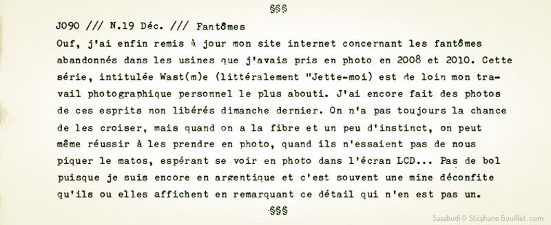 Ouf, j'ai enfin remis à jour mon site internet concernant les fantômes abandonnés dans les usines que j'avais pris en photo en 2008 et 2010. Cette série, intitulée Wast(m)e (littéralement "Jette-moi") est de loin mon travail photographique personnel le plus abouti. J'ai encore fait des photos de ces esprits non libérés dimanche dernier. On n'a pas toujours la chance de les croiser, mais quand on a la fibre et un peu d'instinct, on peut même réussir à les prendre en photo, quand ils n'essaient pas de nous piquer le matos, espérant se voir en photo dans l'écran LCD… Pas de bol puisque je suis encore en argentique et c'est souvent une mine déconfite qu'ils ou elles affichent en remarquant ce détail qui n'en est pas un.