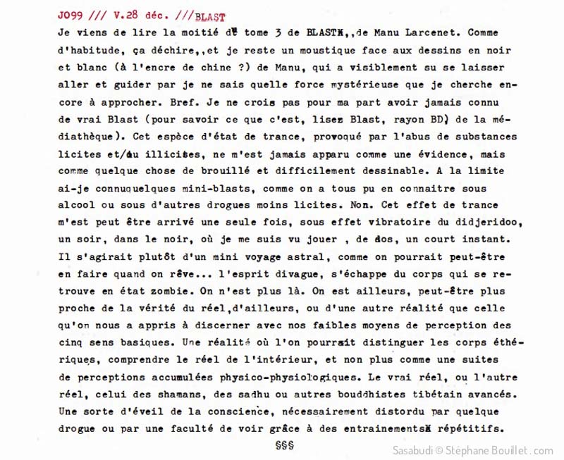 Je viens de lire la moitié du tome 3 de BLAST, de Manu Larcenet. Comme d'habitude, ça déchire, et je reste un moustique face aux dessins en noir et blanc (à l'encre de chine ?) de Manu, qui a visiblement su se laisser aller et guider par je ne sais quelle force mystérieuse que je cherche encore à approcher. Bref. Je ne crois pas pour ma part avoir jamais connu de vrai Blast (pour savoir ce que c'est, lisez Blast, rayon BD de la médiathèque) Cet espèce d'état de trance, provoqué par l'abus de substances licites et/ou illicites, ne m'est jamais apparu comme une évidence, mais comme quelque chose de brouillé et difficilement dessinable. A la limite ai-je connu quelques mini-blasts, comme on a tous pu en connaitre sous alcool ou sous d'autres drogues moins licites. Non. Cet effet de trance m'est peut être arrivé une seule fois, sous effet vibratoire du didjeridoo, un soir, dans le noir, où je me suis vu jouer, de dos, un court instant. Il s'agirait plutôt d'un mini voyage astral, comme on pourrait peut-être en faire quand on rêve… l'esprit divague, s'échappe du corps qui se retrouve en état zombie. On n'est plus là. On est ailleurs, peut-être plus proche de la vérité du réel, d'ailleurs, ou d'une autre réalité que celle qu'on nous a appris à discerner avec nos faibles moyens de perception des cinq sens basiques. Une réalité où l'on pourrait distinguer les corps éthériques, comprendre le réel de l'intérieur, et non plus comme une suites de perceptions accumulées physico-physiologiques. Le vrai réel, ou l'autre réel, celui des shamans, des sadhus ou autres bouddhistes tibétains avancés. Une sorte d'éveil de la conscience, nécessairement distordu par quelque drogue ou par une faculté de voir grâce à des entrainements répétitifs.