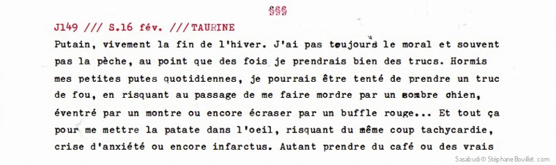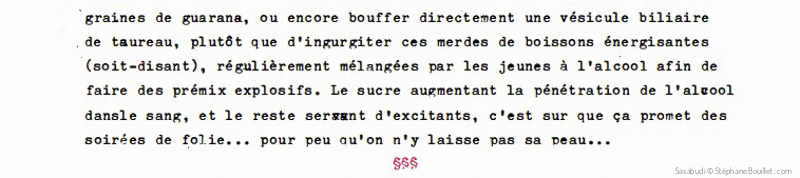 Putain, vivement la fin de l'hiver. J'ai pas toujours le moral et souvent pas la pèche, au point que des fois je prendrais bien des trucs. Hormis mes petites putes quotidiennes, je pourrais être tenté de prendre un truc de fou, en risquant au passage de me faire mordre par un sombre chien, éventré par un montre ou encore écraser par un buffle rouge… Et tout ça pour me mettre la patate dans l'oeil, risquant du même coup tachycardie, crise d'anxiété ou encore infarctus. Autant prendre du café ou des vrais graines de guarana, ou encore bouffer directement une vésicule biliaire de taureau, plutôt que d'ingurgiter ces merdes de boissons soit-disant énergisantes, régulièrement mélangées par les jeunes à l'alcool afin de faire des prémix explosifs. Le sucre augmentant la pénétration de l'alcool dans le sang, et le reste servant d'excitants, c'est sûr que ça promet des soirées de folie… pour peu qu'on n'y laisse pas sa peau…