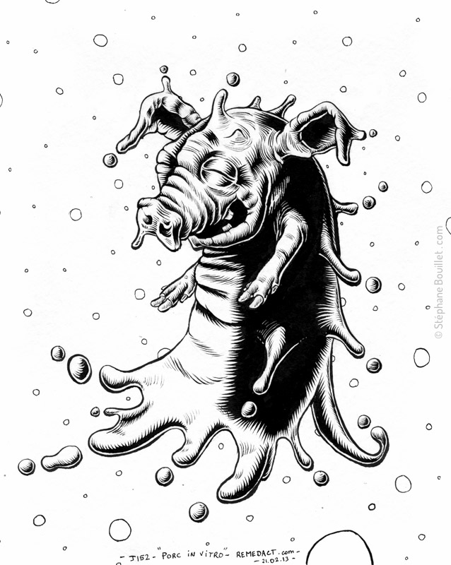 J'avais déjà un peu parlé du cochon, et plus exactement du porc, la viande la plus consommée en France. Sous forme de ce qu'on veut, des lardons à l'échine, en passant par la gélatine dans les bonbons, que même les musulmans y sont pas au courant. Bref. Le souci, c'est que la viande, sous nos tropiques, avec les élevages industrielles du porcs avachis, eh bien c'est de plus en plus de la merde, et même devrais-je dire, de la flotte. Comme les légumes en fait: on les fait gonfler comme un body-builder, mais au lieu de glycogène, on met de la flotte. Faut donc pas s'étonner si nos courgettes ont un goût de lardons ou l'inverse: y'a plus de goût du tout ! Mine de rien et quoiqu'on en dise, le bio sauve un peu les apparences, puisque logiquement il pousse (un peu) moins vite, et concentre ainsi le goût. Enfin pas une raison suffisante pour devenir copain comme cochon avec le bio, qui vient parfois de l'autre coté de la planète. On peut aussi se demander si notre cher porc aura été un jour un cochon, autrement dit s'il ne viendra pas directement d'une culture de cellules musculaires cultivées in vitro. Ce pourrait être un rêve éveillé un de ces jours, puisqu'il est possible aujourd'hui de cultiver de telles cellules in vitro, dans des milieux de culture. Seul problème, la "viande" qui en est issue est gluante à souhait, n'ayant pas subi les efforts nécessaires aux déplacements d'un vrai cochon par exemple. Reste à savoir aussi si ce sera rentable économiquement, mais si c'est le cas, ça pourrait révolutionner l'élevage traditionnel (enfin, surtout industriel), et c'est sans doute pas Brigitte Bardot qui s'en plaindra…