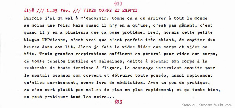 Parfois j'ai du mal à m'endormir. Comme ça a dû arriver à tout le monde au moins une fois. Mais quand il n'y en a qu'une, c'est pas gênant, c'est quand il y en a plusieurs que ça pose problème. Bref, hormis cette petite blague UMPéienne, c'est vrai que c'est parfois très chiant, de cogiter des heures dans son lit. Alors je fais le vide: vider son corps et vider sa tête. Trois grandes respirations suffisent en général pour vider son corps, de toutes tensions inutiles et malsaines, quitte à "scanner" son corps à la recherche de toutes tensions à flinguer. Le scannage intervient ensuite pour le mental: scanner son cerveau et détruire toute pensée aussi rapidement qu'elles surviennent, comme lors de méditation. Avec un peu de pratique, on s'en sort plutôt pas mal et de plus en plus rapidement; et ça tombe bien, on peut pratiquer tous les soirs…