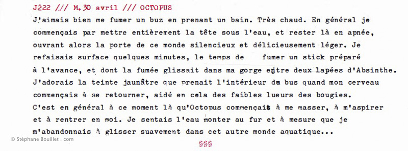 J'aimais bien me fumer un buz en prenant un bain. Très chaud. En général je commençais par mettre entièrement la tête sous l'eau, et rester là en apnée, ouvrant alors la porte de ce monde silencieux et délicieusement léger. Je refaisais surface quelques minutes, le temps de fumer un stick préparé à l'avance, et dont la fumée glissait dans ma gorge entre deux lapées d'Absinthe. J'adorais la teinte jaunâtre que prenait l'intérieur du bus quand mon cerveau commençais à se retourner, aidé en cela par les faibles lueurs des bougies. C'est en général à ce moment là qu'Octopus commençait à me masser, à m'aspirer et à rentrer en moi. Je sentais l'eau monter au fur et à mesure que je m'abandonnais à glisser suavement dans cet autre monde aquatique…