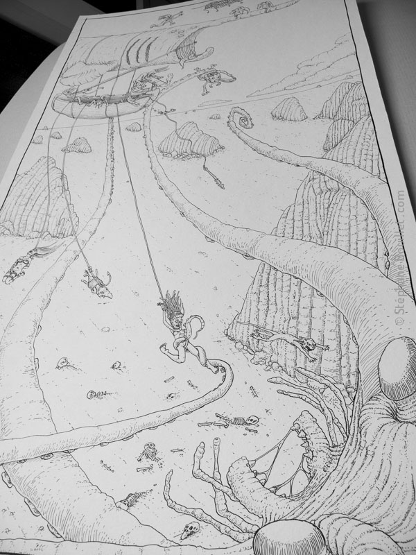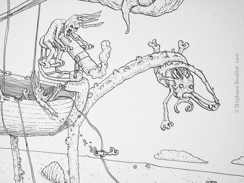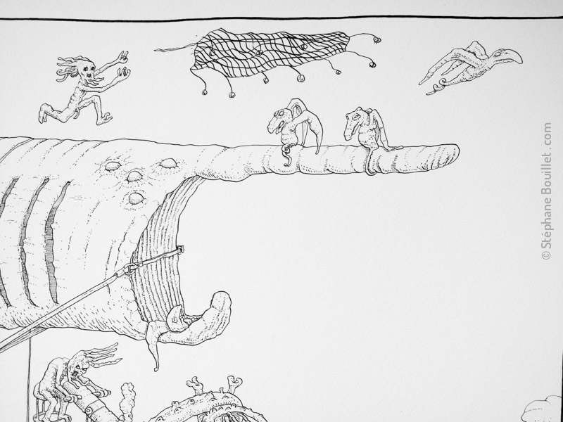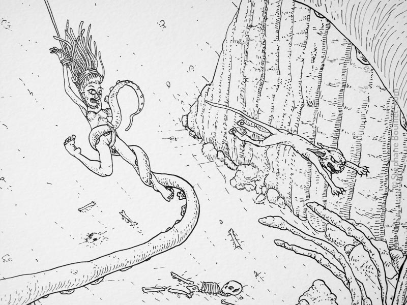 A mon avis, j'étais en train de vivre mes derniers instants. J'avais ,même plus le temps d'avoir mal aux poignets ou au passage de cet espèce d'énorme hameçon sur lequel j'étais ligotée. Ces saloperies de bestioles se servaient de nous comme des appâts pour un monstre dont je n'aurais même pas imaginé l'existence. À coté de sa gueule puante énorme, mes cauchemars me paraissaient des rêves d'enfants. Je ne voyais plus que ça: ses mandibules baveuses, entourées de sortes de petites pattes gluantes. Et le fond de sa gueule dans laquelle je me voyais déjà… C'est là qu'un truc a rebondit sur mon épaule. Un truc que j'ai vite identifié comme étant Spynx, mon chat nu, bondissant vers un des yeux, toutes griffes dehors, de cette espèce de monstrueuse pieuvre terrestre géante…