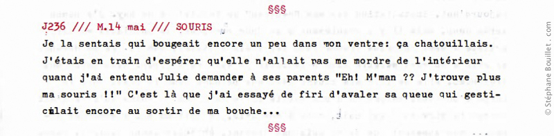 Je la sentais qui bougeait encore un peu dans mon ventre: ça chatouillait. J'étais en train d'espérer qu'elle n'allait pas me mordre de l'intérieur quand j'ai entendu Julie demander à ses parents "Eh! M'man ?? J'trouve plus ma souris !!" C'est là que j'ai essayé de finir d'avaler sa queue qui gesticulait encore au sortir de ma bouche…