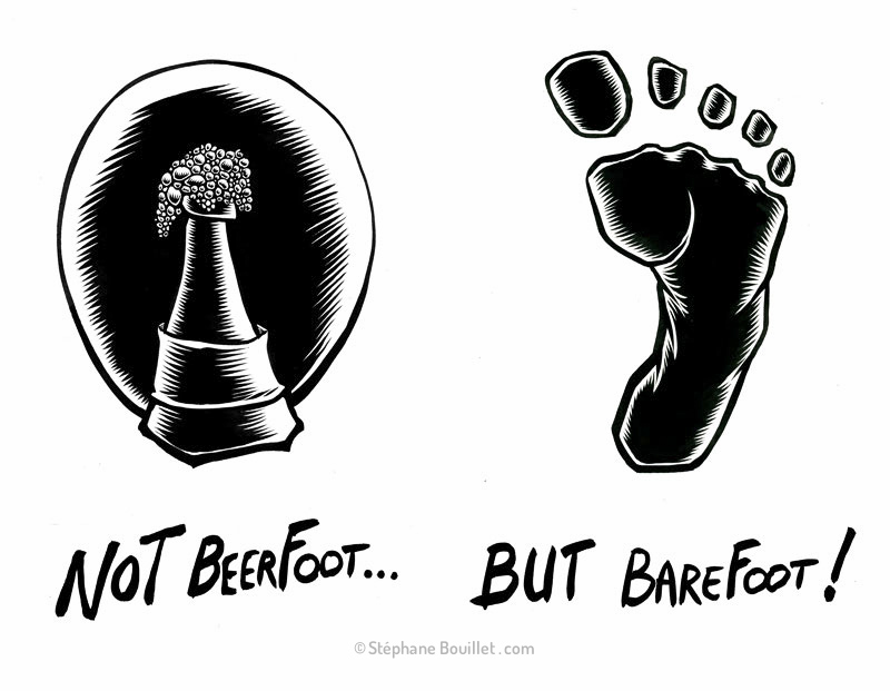 ILLUSTRATION : Bière et ballon de foot ? Non ! Barefoot ! Le pied… nu ! TEXTE : Comme j’écris mes billets de sasabudi en retard en ce moment, je ne m’en rappelle pas, mais j’ai bien du barefooter après mon jogging ce dimanche. Et justement, j’avais pensé à des idées de T-shirt à ce sujet, en faisant des jeux de mots minables, mais pourquoi pas, du genre « Not Beer Foot, But Bare Foot ». Enfin voilà… C’était juste ça… O°/
