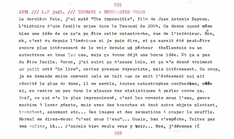 La dernière fois, j'ai maté "The impossible", film de Juan Antonio Bayona. L'histoire d'une famille prise dans le Tsunami de 2004 . Ça donne quand même bien une idée de ce qu'a pu être cette catastrophe, vue de l'intérieur. Bon, OK, c'est vu depuis l'Amérique si je puis dire, et ça aurait été peut-être encore plus intéressant de le voir depuis un pêcheur thaïlandais ou un autochtone en tous les cas, mais ça donne déjà une bonne idée. Et ça a pas du être facile. Perso, j'ai suivi ça d'assez loin, et ça m'a donné vraiment un petit coté "in live", certes presque voyeuriste, mais intéressant. Du coup, je me demande moins comment cela se fait que ce soit l'événement qui ait récolté le plus de dons, il me semble, toutes catastrophes confondues, même si, on rentre un peu dans le glauque des statistiques à parler comme ça. Bref, ce qui m'a le plus impressionné, c'est les moments sous l'eau, genre machine à laver géante, mais avec des branches et tout autre objets plantant, tranchant, assommant etc… Des images et des sensations à coupe le souffle. Normal me direz-vous: "c'est sous l'eau"… Ouais, ben n'empêche, faites pas vos malins, là… J'aurais bien voulu vous y voir… Non, j'déconne 🙁