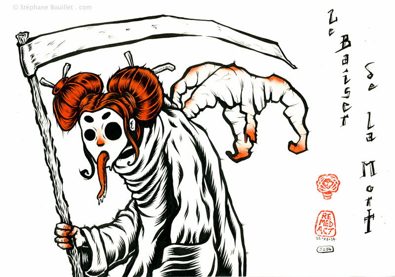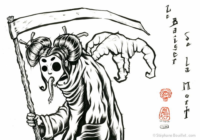 légende : portrait de l'ange de la mort, japonais. Elle porte des ailes légèrement poilues, deux chignons coincés avec des baguettes chinoises, la faux de la mort, et tire une grande langue, prête à embrasser sa prochaine victime du baiser de la mort