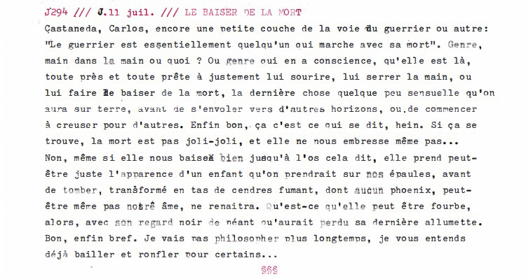 Castaneda, Carlos, encore une petite couche de la voie du guerrier ou autre: "Le guerrier est essentiellement quelqu'un qui marche avec sa mort". Genre, main dans la main ou quoi ? Ou genre qui en a conscience, qu'elle est là, toute près et toute prête à justement lui sourire, lui serrer la main, ou lui faire le baiser de la mort, la dernière chose quelque peu sensuelle qu'on aura sur terre, avant de s'envoler vers d'autres horizons, ou de commencer à creuser pour d'autres. Enfin bon, ça c'est ce qui se dit, hein. Si ça se trouve, la mort est pas joli-joli, et elle ne nous embrasse même pas… Non, même si elle nous baise bien jusqu'à l'os cela dit, elle prend peut-être juste l'apparence d'un enfant qu'on prendrait sur nos épaules, avant de tomber, transformé en tas de cendres fumant, dont aucun phœnix, peut-être même pas notre âme, ne renaîtra. Qu’est-ce qu'elle peut être fourbe, alors, avec son regard noir de néant qu’aurait perdu sa dernière allumette. Bon, enfin bref. Je vais pas philosopher plus longtemps, je vous entends déjà bâiller et ronfler pour certains…