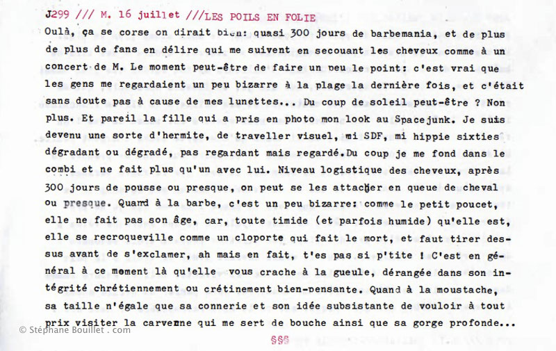 Houlà, ça se corse on dirait bien: quasi 300 jours de barbemania, et de plus de plus de fans en délire qui me suivent en secouant les cheveux comme à un concert de M. Le moment peut-être de faire un peu le point: c'est vrai que les gens me regardaient un peu bizarre à la plage la dernière fois, et c'était sans doute pas à cause de mes lunettes… Du coup de soleil peut-être ? Non plus. Et pareil la fille qui a pris en photo mon look au Spacejunk. Je suis devenu une sorte d’ermite, de traveller visuel, mi-SDF, mi-hippie sixties dégradant ou dégradé, pas regardant mais regardé. Du coup je me fond dans le Combi et ne fait plus qu'un avec lui. Niveau logistique des cheveux, après 300 jours de pousse ou presque, on peut se les attacher en queue de cheval ou presque. Quant à la barbe, c'est un peu bizarre: comme le petit poucet, elle ne fait pas son âge, car, toute timide (et parfois humide) qu'elle est, elle se recroqueville comme un cloporte qui fait le mort, et faut tirer dessus avant de s'exclamer, ah mais en fait, t'es pas si p'tite ! C'est en général à ce moment là qu'elle :vous crache à la gueule, dérangée dans son intégrité chrétiennement ou crétinement bien-pensante. Quand à la moustache, sa taille n'égale que sa connerie et son idée subsistante de vouloir à tout prix visiter la caverne qui me sert de bouche ainsi que sa gorge profonde…