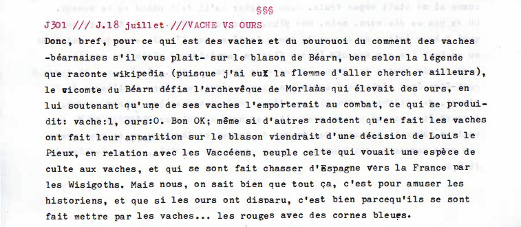 Donc, bref, pour ce qui est des vaches et du pourquoi du comment des vaches -béarnaises s'il vous plaît- sur le blason du Béarn, ben selon la légende que raconte Wikipedia (puisque j'ai eu la flemme d'aller chercher ailleurs), le vicomte du Béarn défia l'archevêque de Morlaàs qui élevait des ours, en lui soutenant qu'une de ses vaches l'emporterait au combat, ce qui se produisit: vache: 1, ours: O. Bon OK; même si d'autres radotent qu'en fait les vaches ont fait leur apparition sur le blason à la suite d'une décision de Louis le Pieux, en relation avec les Vaccéens, peuple celte qui vouait une espèce de culte aux vaches, et qui se sont fait chasser d'Espagne vers la France par les Wisigoths. Mais nous, on sait bien que tout ça, c'est pour amuser les historiens, et que si les ours ont disparu, c'est bien parce qu'ils se sont fait mettre par les vaches… les rouges avec des cornes bleues.