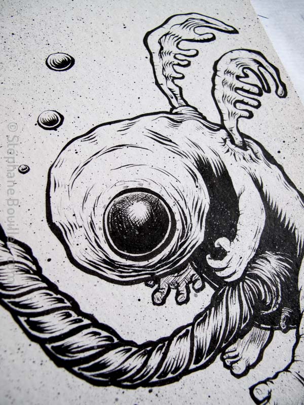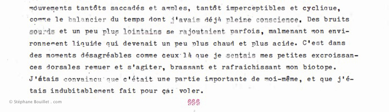 J’entendais comme des tambours au rythme plus ou moins régulier. Je me demandais s’ils tapaient dans ma tête ou en dehors, mais j’aurais plutôt dit en dehors, car en moi semblait battre un tambour bien plus petit et plus rapide. Enfin de toute façon tout cela ne signifiait rien pour moi, et n’avait pas d’autre importance que de me bercer, et de déclencher des mouvements tantôt saccadés et amples, tantôt imperceptibles et cycliques, comme le balancier du temps dont j’avais déjà pleine conscience. Des bruits sourds et un peu plus lointains se rajoutaient parfois, malmenant mon environnement liquide qui devenait un peu plus chaud et plus acide. C’est dans des moments désagréables comme ceux-là que je sentais mes petites excroissances dorsales remuer et s’agiter, brassant et rafraîchissant mon biotope. J’étais convaincu que c ‘était une partie importante de moi-même, et que j’étais indubitablement fait pour ça: voler.
