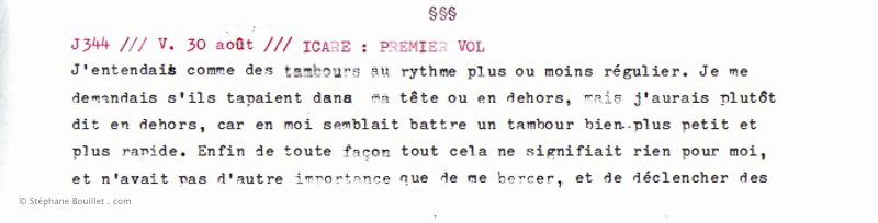 J’entendais comme des tambours au rythme plus ou moins régulier. Je me demandais s’ils tapaient dans ma tête ou en dehors, mais j’aurais plutôt dit en dehors, car en moi semblait battre un tambour bien plus petit et plus rapide. Enfin de toute façon tout cela ne signifiait rien pour moi, et n’avait pas d’autre […]
