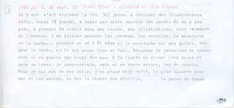 Ça y est: c’est vraiment la fin. 365 jours. À réaliser des illustrations (enfin, moins 75 jours), à taper sur cette machine des années 60 ou à peu près, à prendre du retard dans mes textes, mes illustrations, trop rarement de l’avance. À me laisser pousser les cheveux, les sourcils, la moustache et la barbe … pendant un an ! Et même si la moustache est une galère, ben pour le reste, on le vit assez bien en fait. Beaucoup de personnes me demandent si ça gratte pas trop. Ben non. A la limite en climat tropical et sans se laver, je comprendrais, mais si on reste propre, pas de soucis.