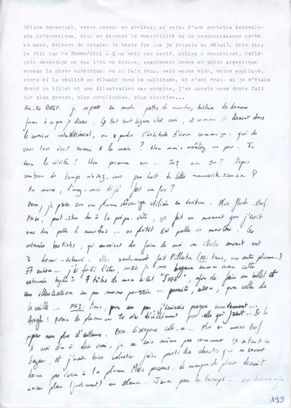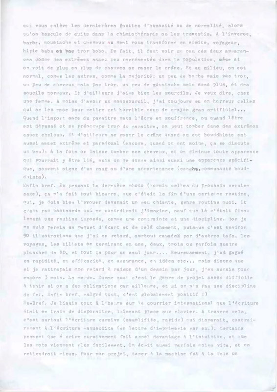 Re-Bref. Je lisais tout à l’heure sur le courrier international que l’écriture était en train de disparaître, laissant place au clavier. À travers cela, c’est surtout l’écriture cursive (simplifiée, rapide) qui disparaît, contrairement à l’écriture manuscrite (en lettre d’imprimerie par ex.). Certains pensent que écrire cursivement fait appel davantage à l’intuition, et que les mots viennent plus facilement. On écrit aussi parfois moins vite, et on retiendrait mieux. Pour mon projet, taper à la machine fut à la fois un délire personnel, entre retour en arrière, et refus d’une certaine technologie informatique, tout en gardant la possibilité de la reconnaissance après un scan, évitant de retaper le texte (ce que je faisais au début). Cela dit le fait que le Pomme/Ctrl + Z ne soit pas actif, oblige à concentrer, réfléchir davantage ce que l’on va écrire, exactement comme en photo argentique versus la photo numérique : on en fait plus, mais moins bien, moins appliqué, comme si la qualité se diluait dans la multitude. Et c’est vrai: si je m’étais donné un billet et une illustration par semaine, j’en aurais sans doute fait des plus grandes, plus compliquées, plus abouties …