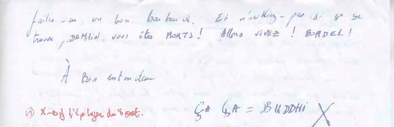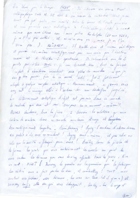 RE-BREF. Il semble vrai et même véridique et prouvé ici-même scientifiquement par ma main que l'écriture cursive est 1. illisible 2. spontanée. 3. intéressante sur les 2 points pré-cités. DONC : je me demande bien, tout en faisant sciemment l'exploit d'abandonner mes pattes de mouches, ce que je vais bien pouvoir faire de ce nouvel outil, fut-il futilement adapté à quelque emploi artistique – Heureusement, si jamais vous avez u le courage allié à l'audace de me déchiffrer jusqu'ici, le détournement artistique d'objet est permis dans ce monde de malades que vous & moi occupons en ce moment-même !!