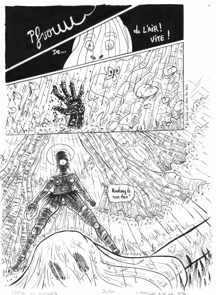 Cette planche est la deuxième évoquant réellement la naissance d'une luciole, sortant littéralement de terre, enveloppée d'un drap blanc évoquant une tête de mort, devant les yeux multiples de la sorcière mambo Mam'zel Kong qui dit en créole haïtien "Koukouy la nan bwa", ce qui signifie "La luciole est dans les bois". Cette phrase fait l'objet d'une explication approfondie dans l'épilogue du tome 4.