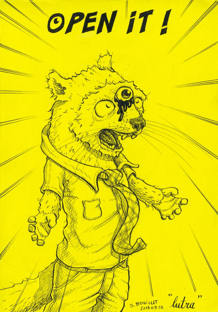 Lutra (la loutre) – série "Open it !" Ouverture sanguinolente du troisième œil chez une loutre en chemise courte et cravate. Le troisième œil, dans l'ésotérisme, est l’œil de la connaissance, situé au 6e chakra (hindouisme et bouddhisme), un point de focalisation pour la méditation (taoïsme et pratiques méditatives). Son ouverture apporterait perceptions nouvelles et […]