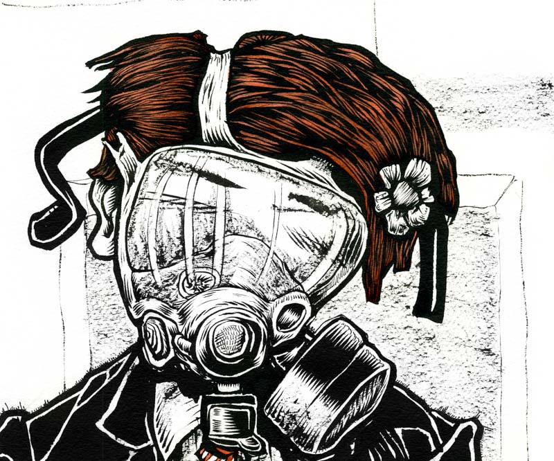Salaryman flower Un salaryman japonais, homme d'affaire typiquement en costard cravate, porte un masque à gaz, une cravate rayée rouge assortie à ses cheveux rouges. Il a une fleur dans les cheveux. Évocation de l'accident nucléaire de Fukushima au Japon