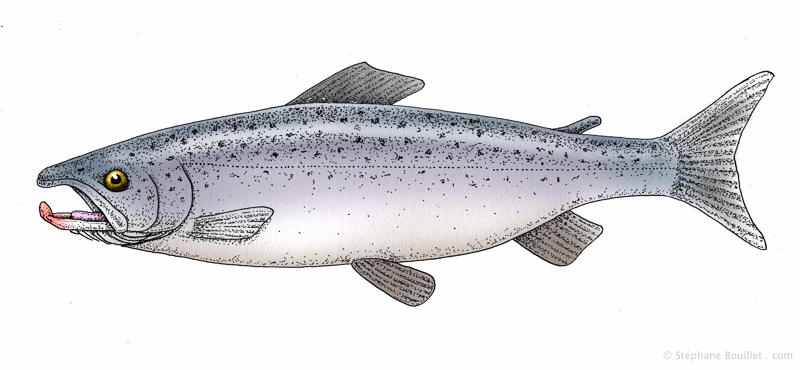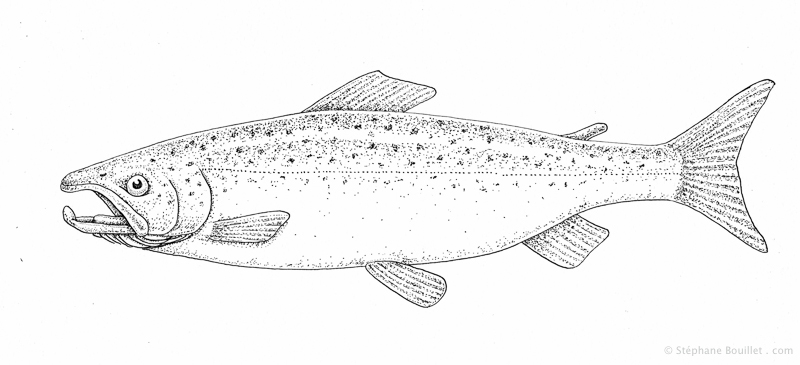 Dessin anatomique de Salmo salar, le saumon de l'Atlantique. Dessin d'illustration pour le livre "Petit manuel de la rivière" aux éditions "La Cheminante"