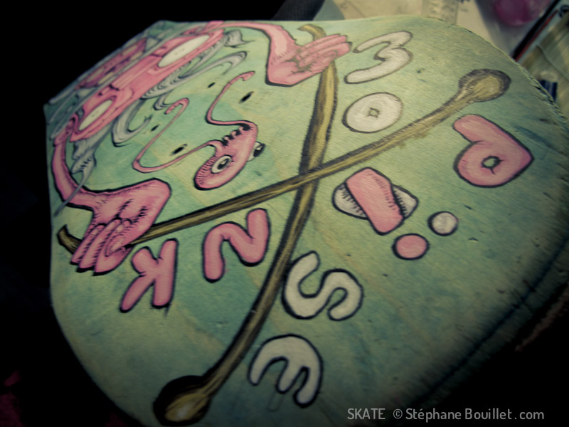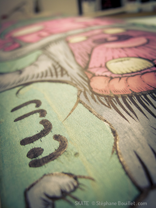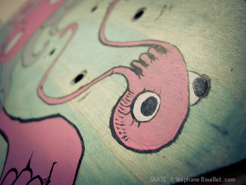 Illustration sur skate pour le groupe musical "Pink Moïse": Moïse rose tenant des baguettes de batterie. Un bébé méduse regarde les baguettes.