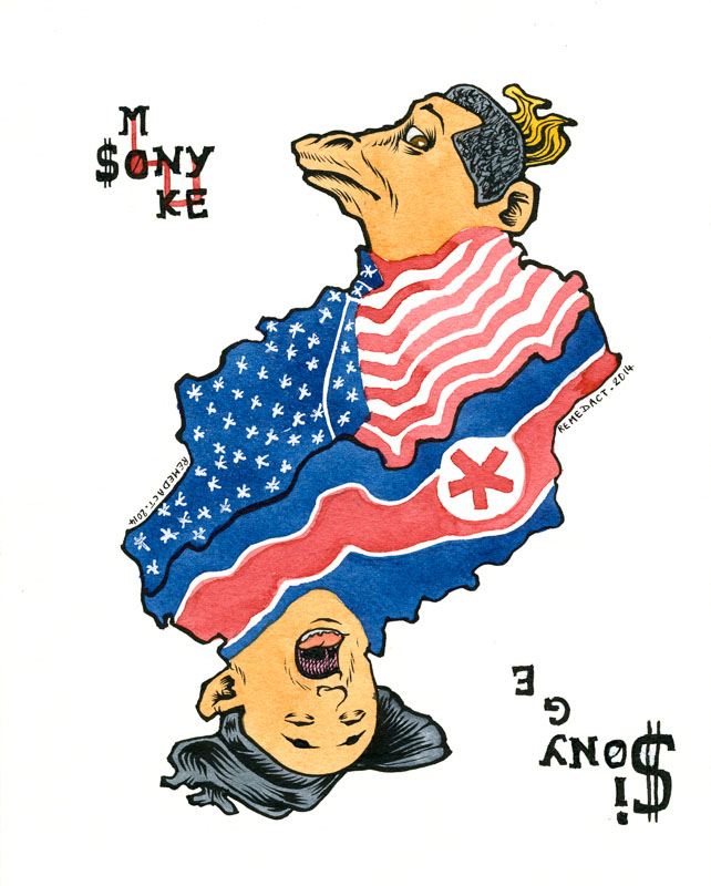 Portraits de Kim Jong-un et Barack Obama en singe, comme deux personnage d'une carte basée sur le territoire de la Corée du Nord et des drapeaux respectifs des États-Unis et de la Corée du Nord Suite à l'affaire du piratage de Sony Pictures, La Corée du Nord traite Obama de singe et les États-Unis d'enfants morveux
