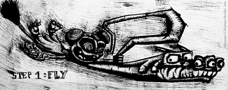 Une jeune sorcière apprend à voler sur son balai à trois yeux, avec son chat et sa peluche lapin.