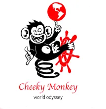 Logo représentant un singe explorant le monde sur un bateau Portrait de chimpanzé conduisant un bateau avec les pieds et ayant une planète en équilibre sur son index Il est assis sur sa queue