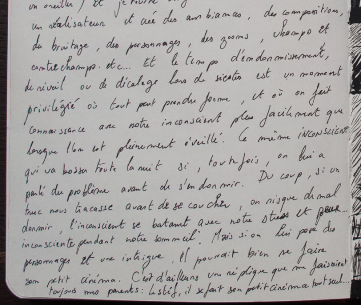 Sketchbook analytique. Association de textes et de dessins les illustrant. ± 1 texte et 1 dessin par jour Ou comment noircir le papier pour blanchir son âme, jeter mots et maux pour s'alléger le cœur, le corps, la tête et l'esprit. NB: ni le texte ni les dessins n'ont vocation à être des chefs-d'œuvre ou des prouesses techniques ou lyriques. C'est juste une méthode de progression.