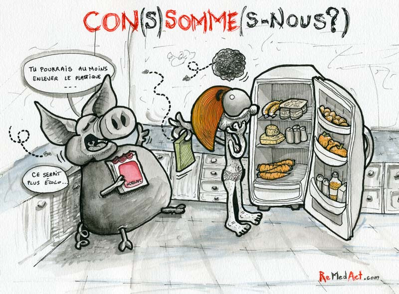 On passe donc parfois directement du cochon au frigo, et du frigo au cochon, qui fait office de poubelle dans ce dessin et parfois dans la réalité.