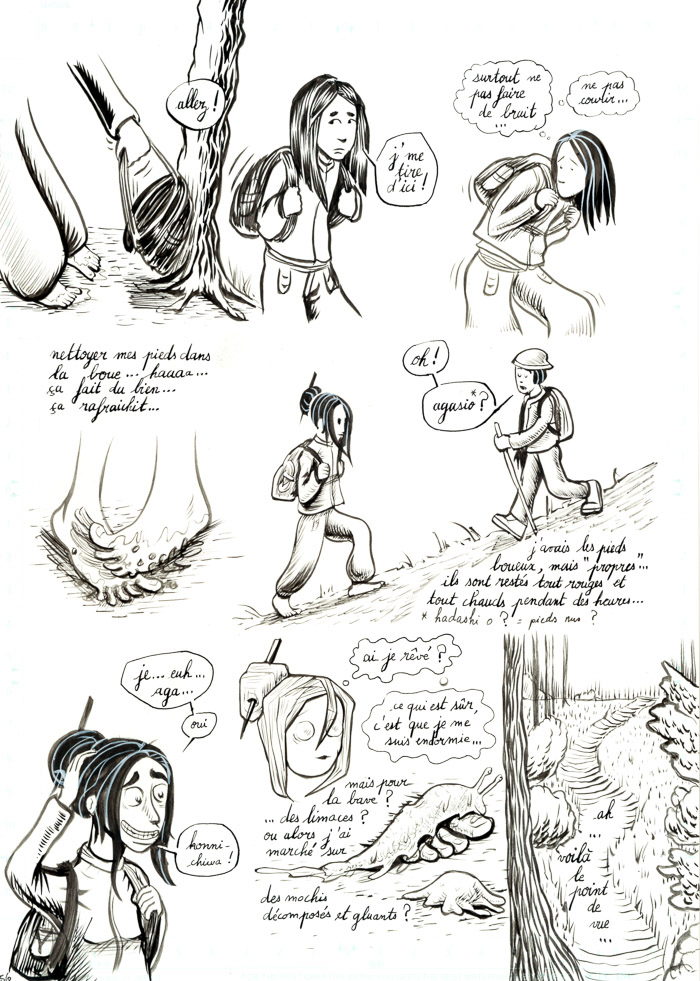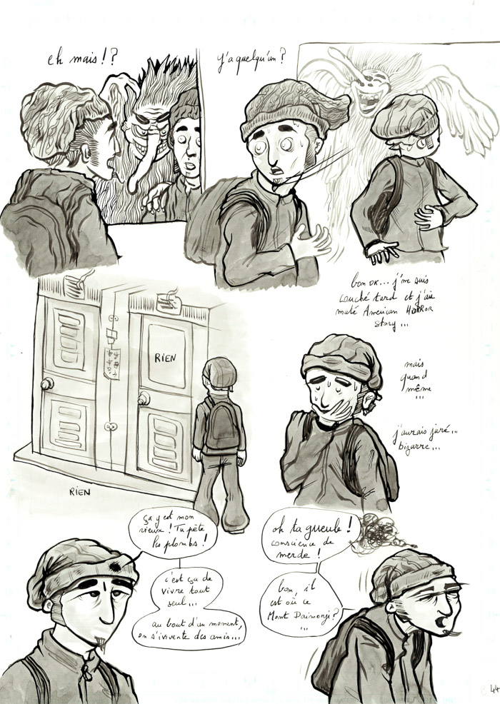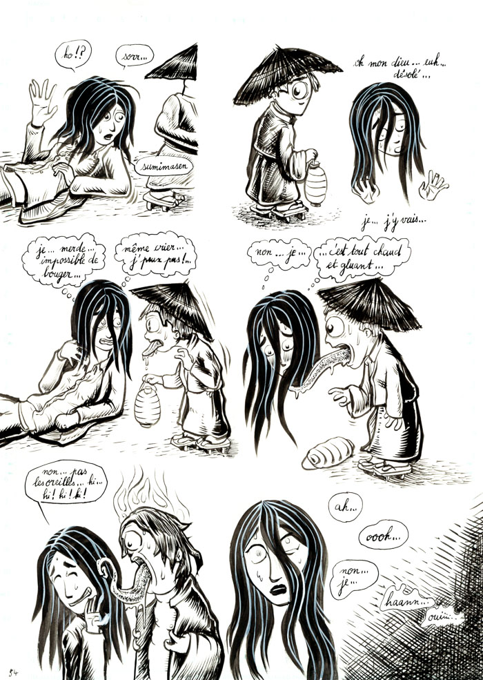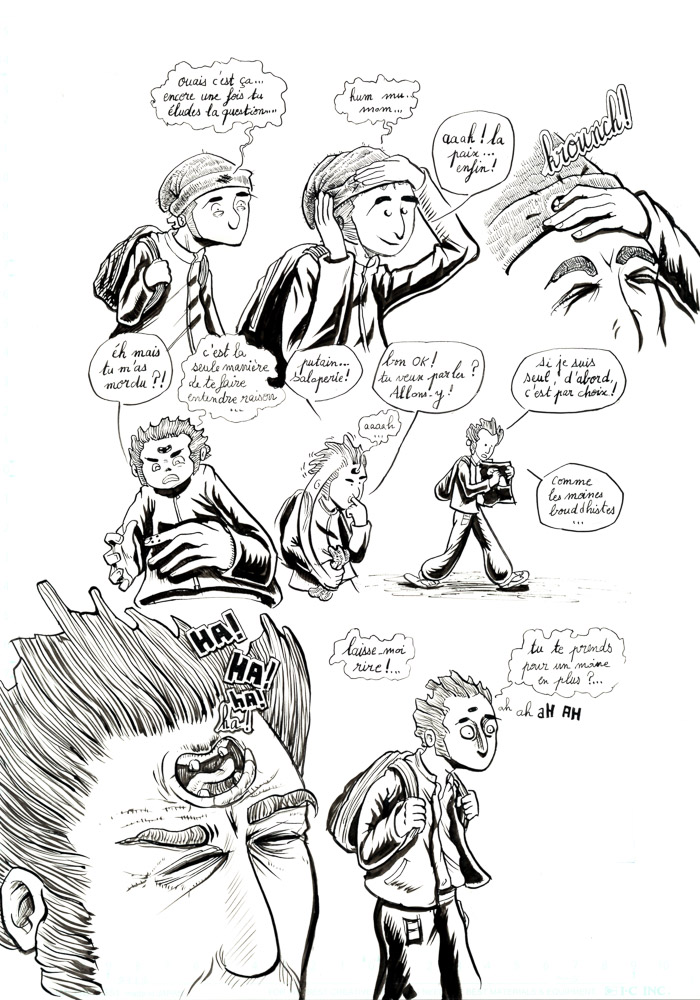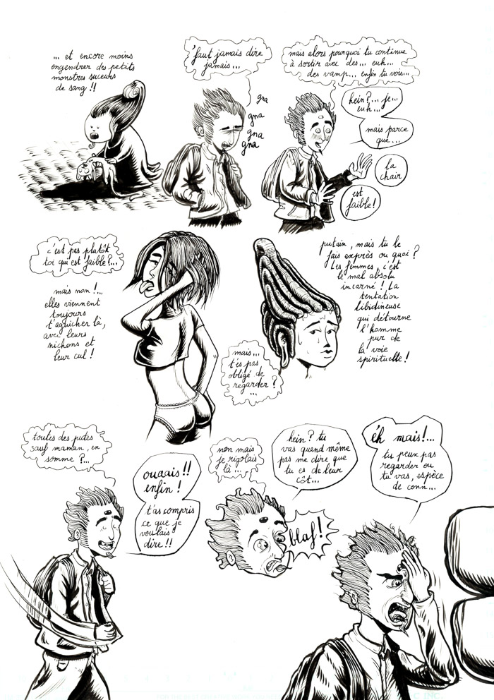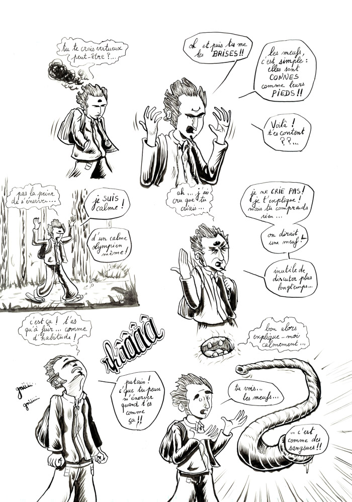 - mouais. bon, c'est vrai que c'est un peu fouillis tout ça. Il y a des pages sympas, et d'autres sur lesquelles j'ai vraiment fait des essais: de plumes G et Maru, de remplissage des ombres en trait ou aplats noirs ou gris… avant de revenir au pinceau lors d'un deuxième ou troisième passage d'encre… Bref, encore de la schizophrénie du trait, entre manga, Burns et Eisner (même si je suis très loin de tout ça, hein). Au moins c'est pas figé… hu hu hu. Mais ça vient.