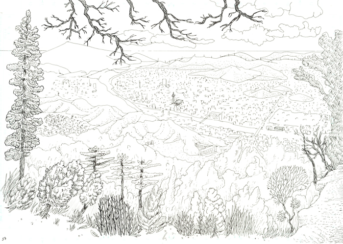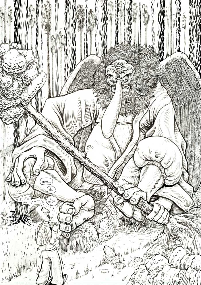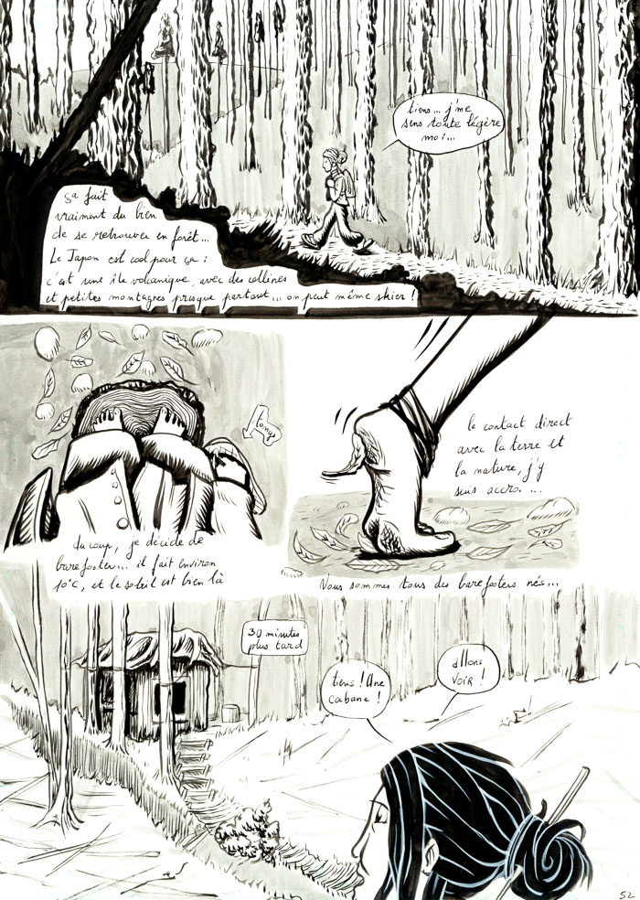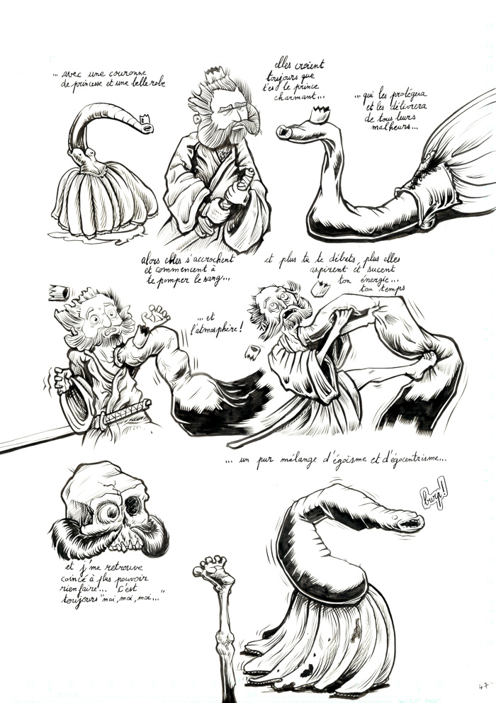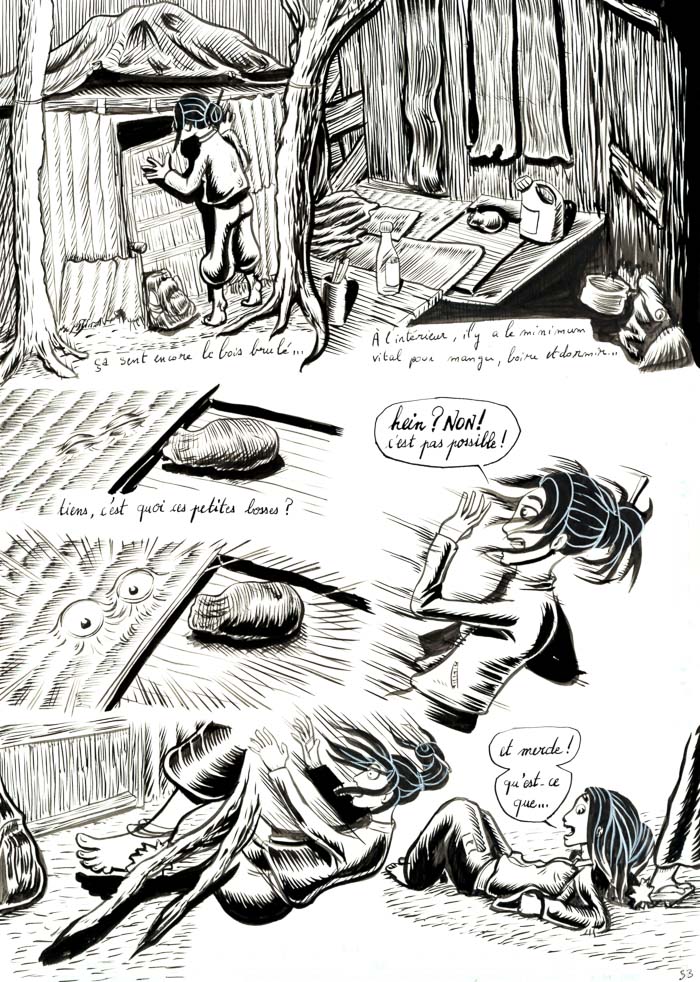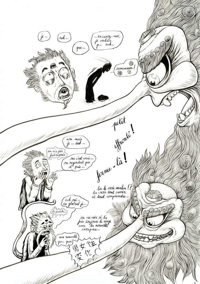 - mouais. bon, c'est vrai que c'est un peu fouillis tout ça. Il y a des pages sympas, et d'autres sur lesquelles j'ai vraiment fait des essais: de plumes G et Maru, de remplissage des ombres en trait ou aplats noirs ou gris… avant de revenir au pinceau lors d'un deuxième ou troisième passage d'encre… Bref, encore de la schizophrénie du trait, entre manga, Burns et Eisner (même si je suis très loin de tout ça, hein). Au moins c'est pas figé… hu hu hu. Mais ça vient.