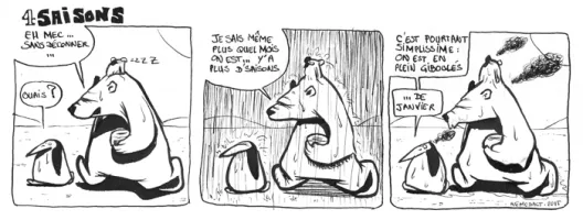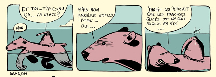 L’idée est de mettre en scène des animaux menacés par le réchauffement climatique: ils ont été obligés de quitter leur milieu de vie naturel pour migrer, faisant d’eux de véritables réfugiés climatiques. Cela permet de les faire voyager et d’aborder toutes les situations causées par le réchauffement climatique.